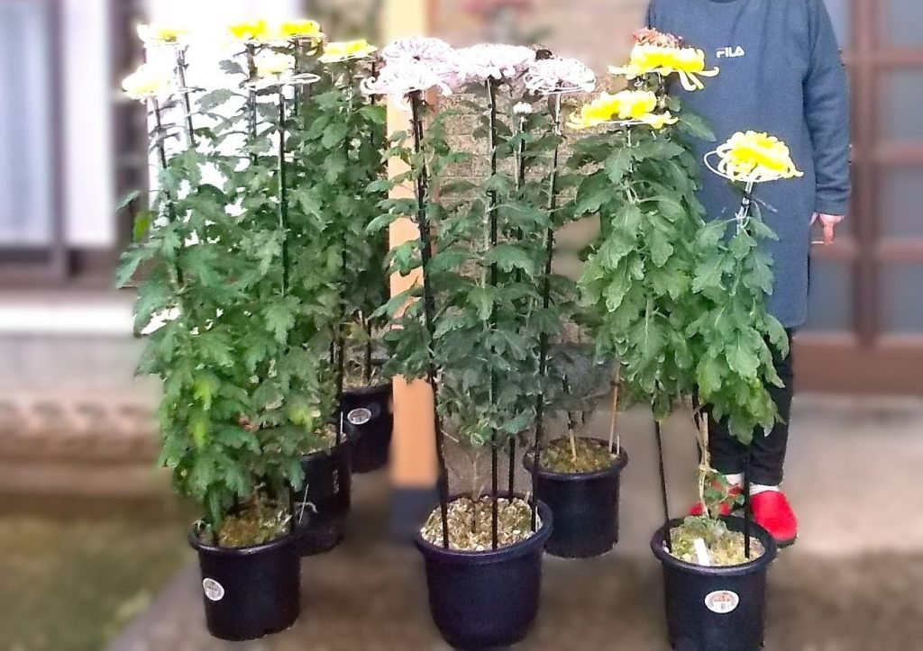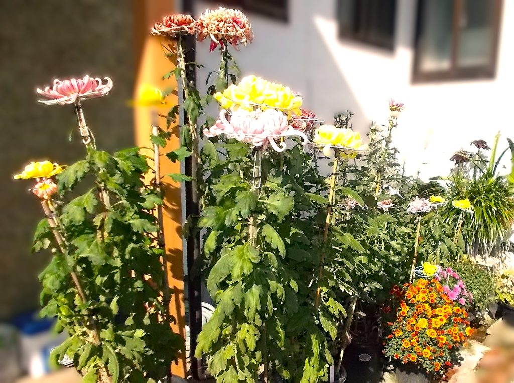 先日。とある お宅へ訪問したところ 奥様が毎年この時期に合わせて育成中の、「大菊」【間違っていたらすいません、花種:未確認です。】鉢をお手入れ中でした。