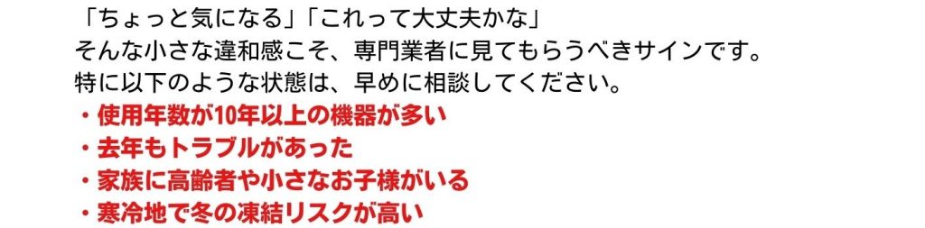 冬のトラブルはご家族にとって大きなご負担になることが多いです。給湯器や暖房器具、設備関係は部品の交換や設備そのものの入替えとなると取り寄せるにも時間がかかり、その期間は全く使えなくなってしまいます。「なんか心配だな」と思われたらお気軽にタカノリフォームにお問い合わせください。