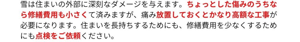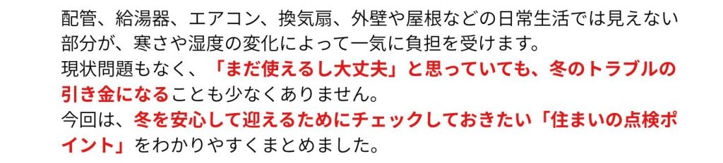 寒い冬を乗り切るために、今のタイミングで住まいの点検をお勧めします。