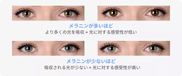 人の目は、虹彩に含まれるメラニン量によって色が異なり、光の感じ方にも差があります。