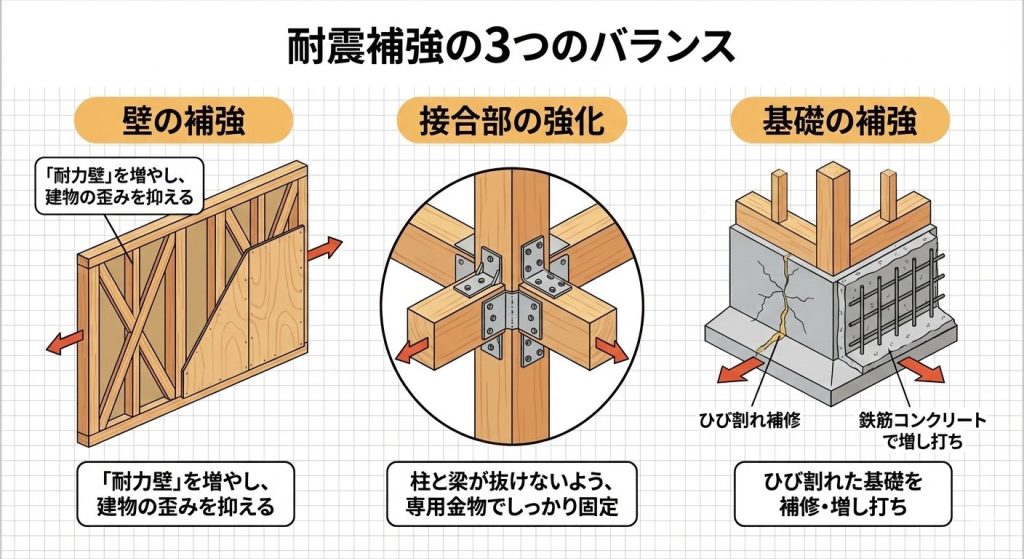 最新の補強技術では、単に家をガチガチに固めるだけでなく、以下の3つのバランスを重視します。
