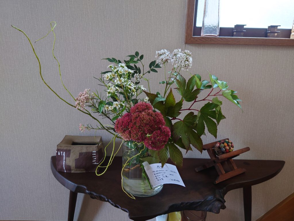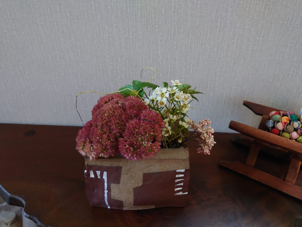 枯れて少なくなったお花を器を変えて楽しんでいます。