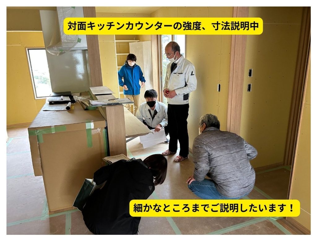 大工完了検査では、今後の工程確認・電気配線・家具配置、収納やカウンターの内容などの確認を行います。